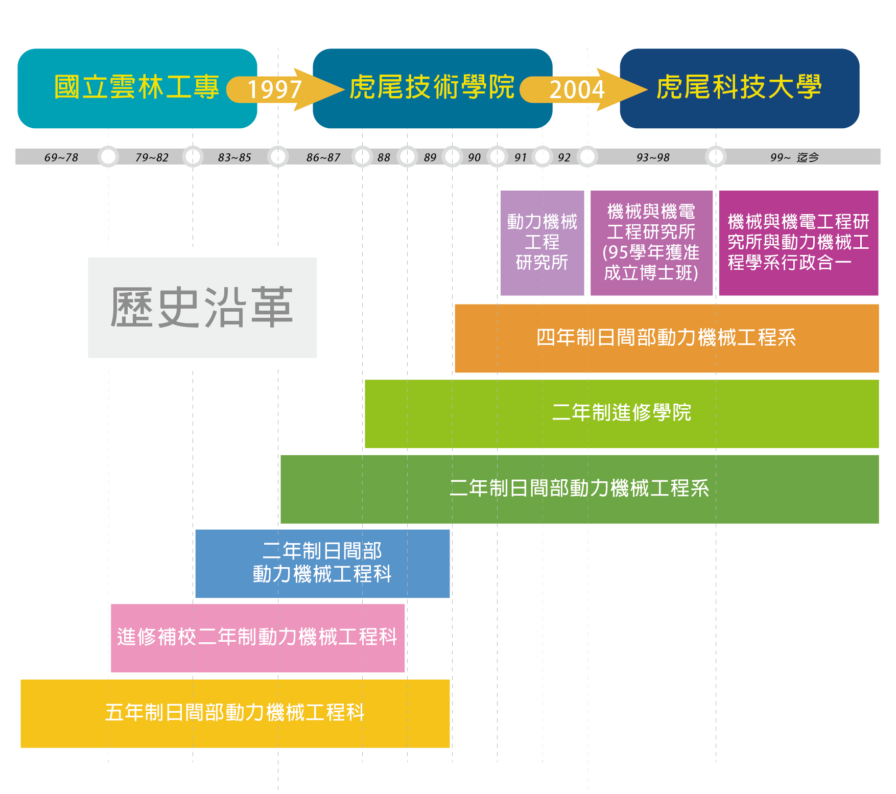 4. July 1997 – The institution was upgraded to National Formosa Institute of Technology. A two-year daytime Department of Power Mechanical Engineering Technology was newly established, recruiting students through the joint entrance examination for two-year technical institutes in the mechanical engineering category. One class (40 students) was admitted annually.