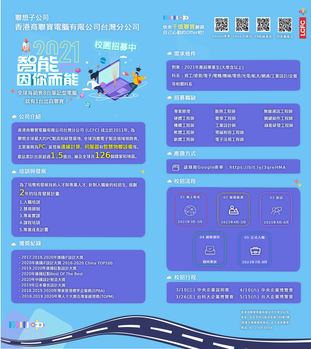 香港商聯寶電腦有限公司台灣分公司(LCFC)成立於2011年,是聯想全球最大的PC製造和研發基地,全球消費電子製造領域的領跑者,主要業務為PC,並發展邊緣計算、伺服器和智慧物聯設備等核心業務。「全球每銷售8台筆記型電腦,就有1台是來自聯寶。」目前產品累計出貨超過1.5億台,遍及全球共126個國家和地區。 聯寶電腦與聯想、全球一流科研機構及世界500強企業建立戰略合作夥伴關係,打造37間業界領先的實驗室,更與全球數百家供應商合作,建構高效供應鏈體系,為全球客戶提供更具競爭力的產品和服務,已連續4年獲得國際工業設計大獎:2017、2018、2020年「德國iF設計大獎」,2020年「德國 iF 2016-2020 China TOP100」,2019、2020年「德國紅點設計大獎」,2020年「德國紅點Best Of The Best」、2020年「中國設計智造大獎」、2019年日本「Good Design Award」。 未來聯寶電腦將立足區域良好的產業環境,堅持科技創新、穩步發展,以「數位化、自動化、智慧化」為導向,全面提升智能製造能力,打造千億級智慧製造產業鏈,以高科技、高品質的產品服務全球客戶。