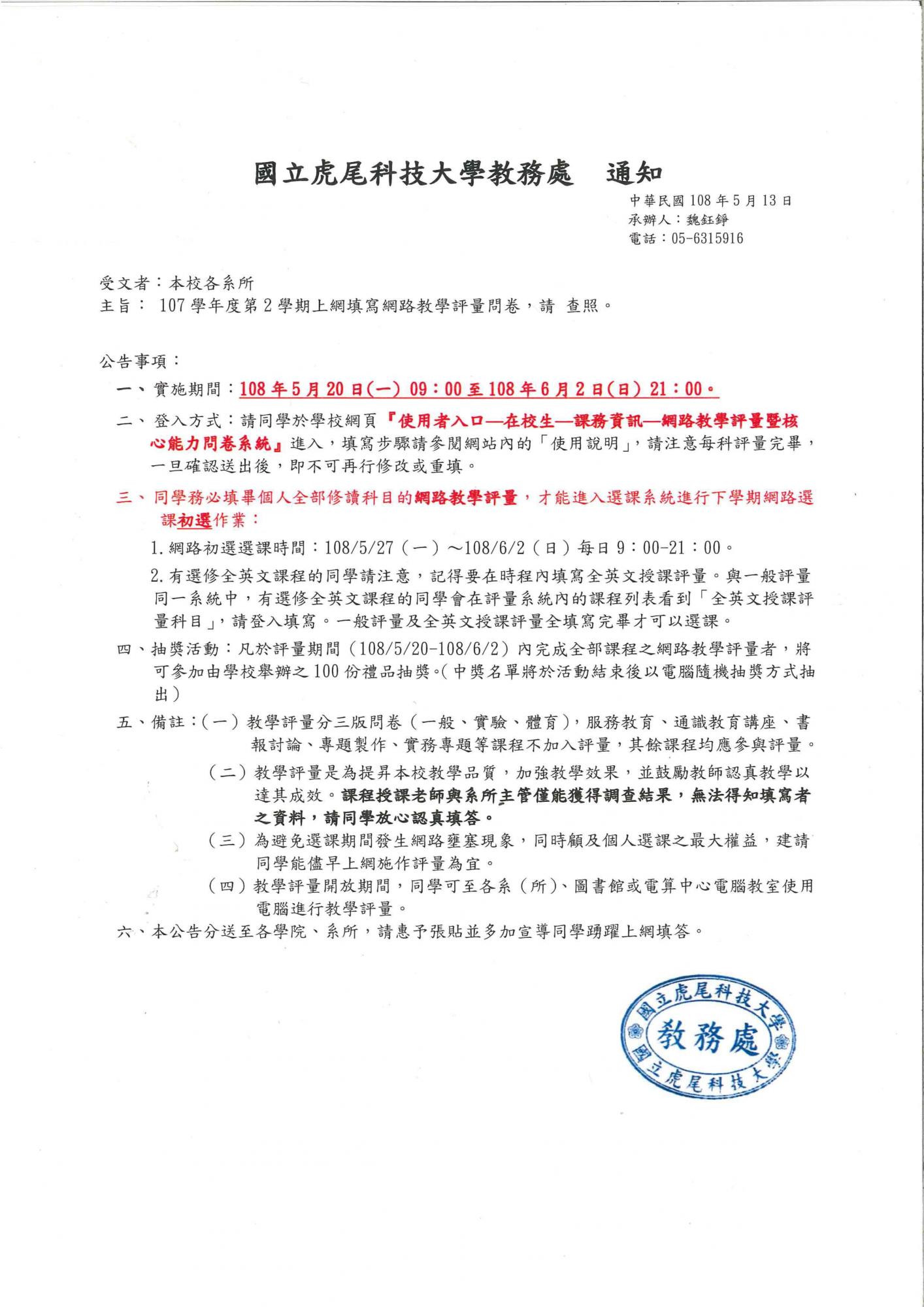 請學生上網填寫107學年度第2學期網路教學評量問卷