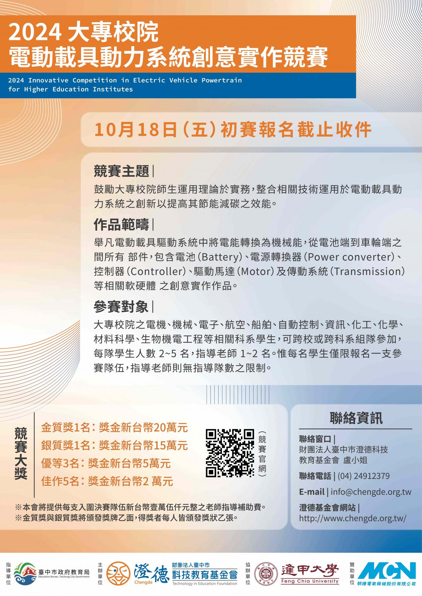 本會「2024大專校院電動載具動力系統創意實作競賽」已經開始報名囉!