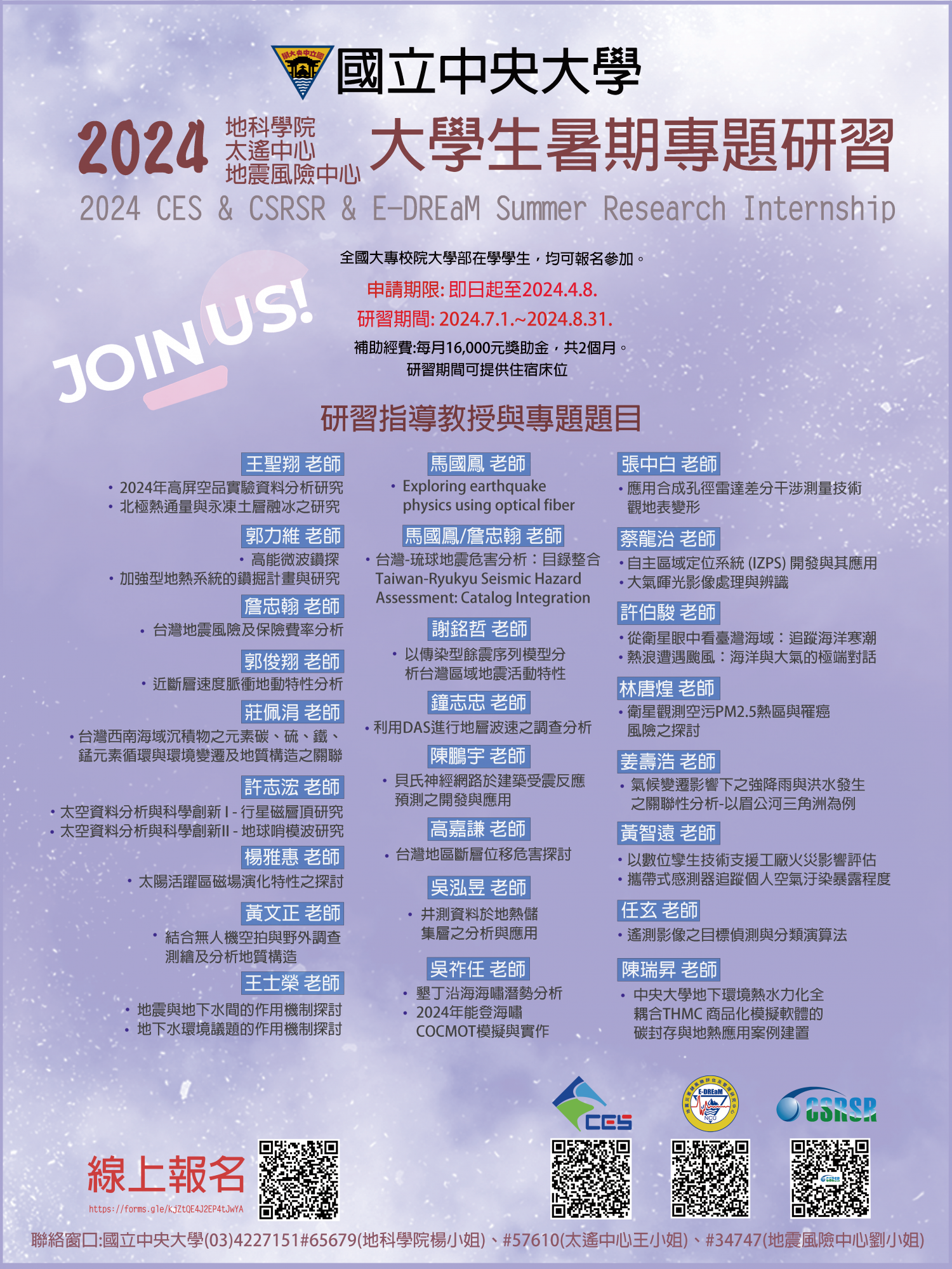 主旨:檢送本校地科院暨太遙中心辦理「2024大學生暑期專題研習」宣傳海報及報名資訊,敬請惠予轉知貴屬學生周知,請查照。