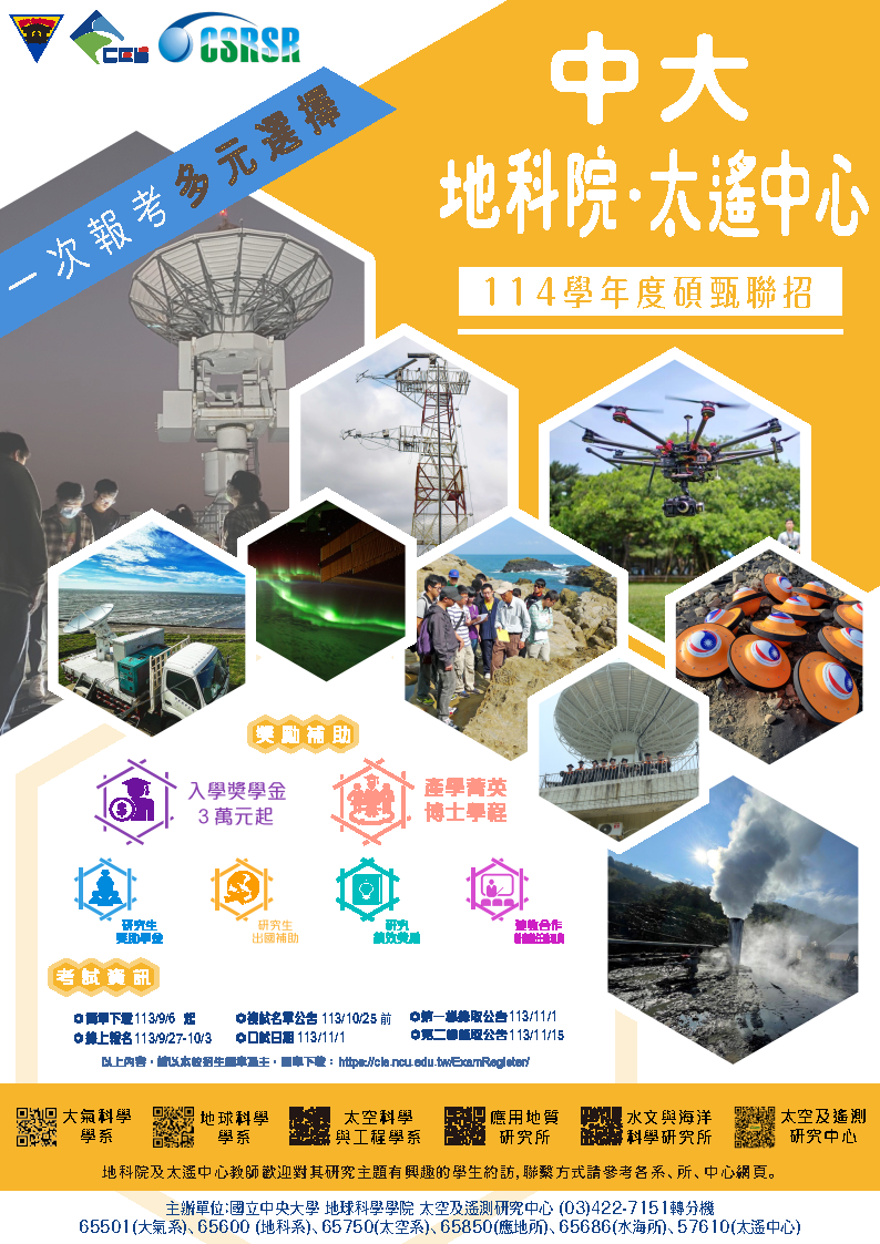 聯招系所:大氣系、地科系、太空系、應地所、水海所、太遙中心遙測科技碩士學位學程