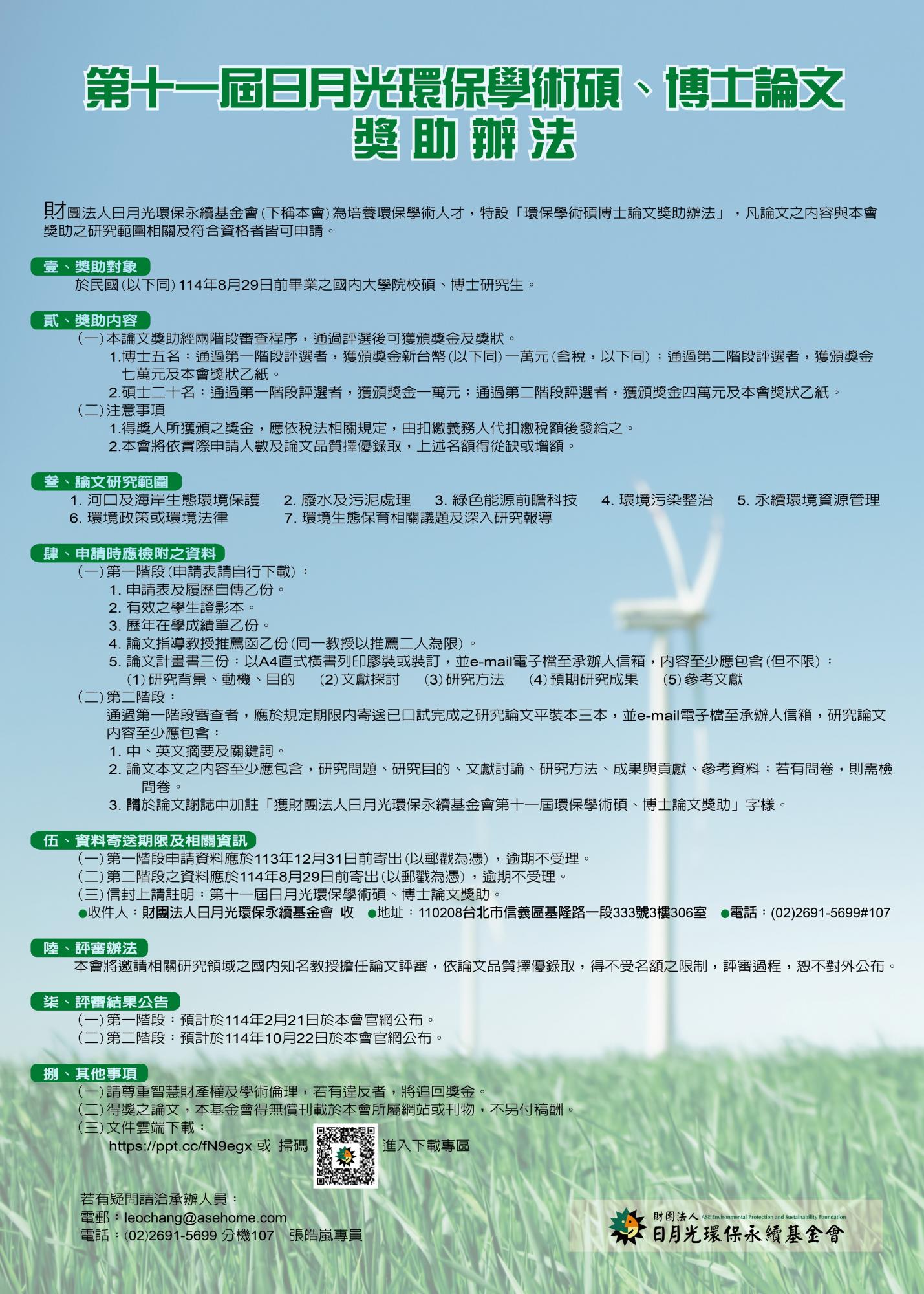 為培養國內環保學術人才,日月光環保永續基金會特設「環保學術碩、博士論文獎助辦法」,凡研究論文題目與本會獎助主題相關者皆可申請,敬請惠予轉知,歡迎貴校學生踴躍報名。