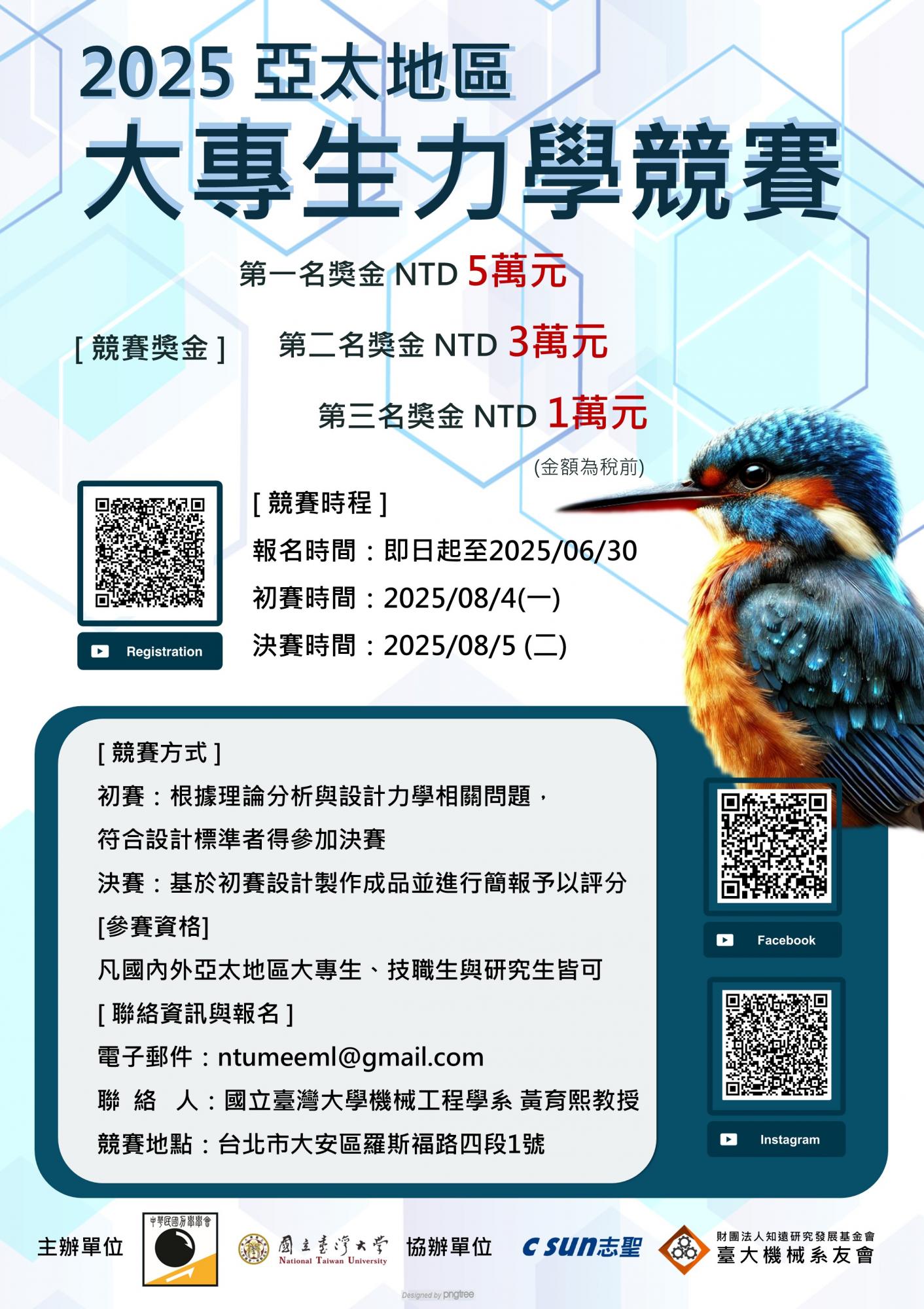 2025亞太地區大專生力學競賽宣傳 [本系] 2025-05-12 AdminAdmin 中華民國力學學會於2025年舉辦的亞太大專生力學競賽, 今年由臺大機械主辦,誠摯邀請貴院系鼓勵學生參與競賽,大專生與研究生皆符合參賽資格! 附件 附件