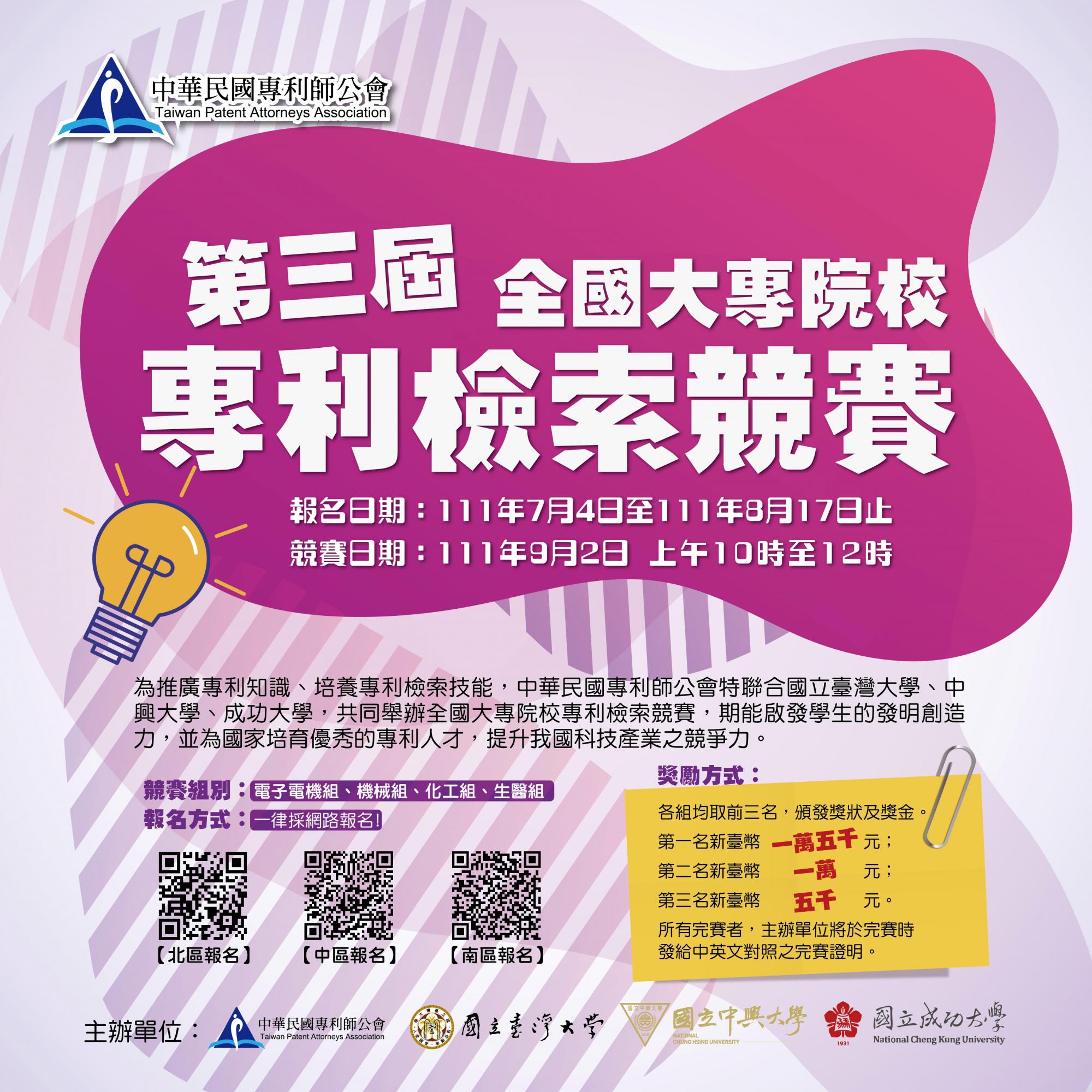 今年專利師公會聯合臺大、中興、成大共同舉辦本次全國專利檢索競賽,高額獎金不因疫情改變,第一名15,000元、第二名10,000元、第三名5,000元,歡迎舊雨新知共同來挑戰。