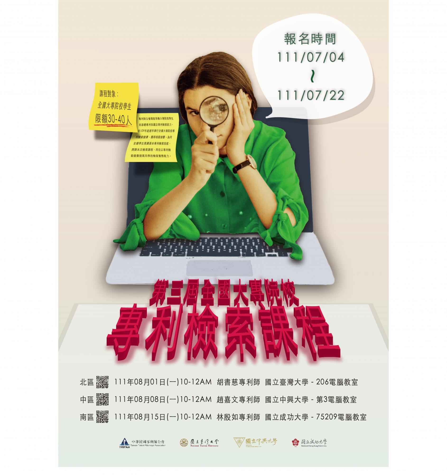 如果您才剛接觸專利檢索,也不用擔心,配合競賽,我們將在臺大、中興及成大舉辦三場的「專利檢索」課程。歡迎同學們來報名我們的「專利檢索」課程,增進檢索技能。