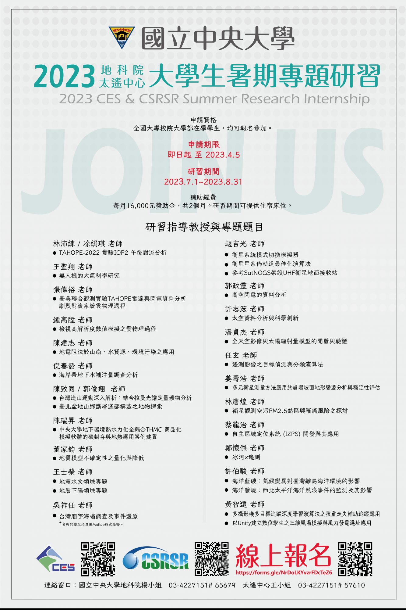 轉知國立中央大學檢送地科院暨太遙中心辦理「2022大學生暑期專題實習」宣傳海報及報名資訊: