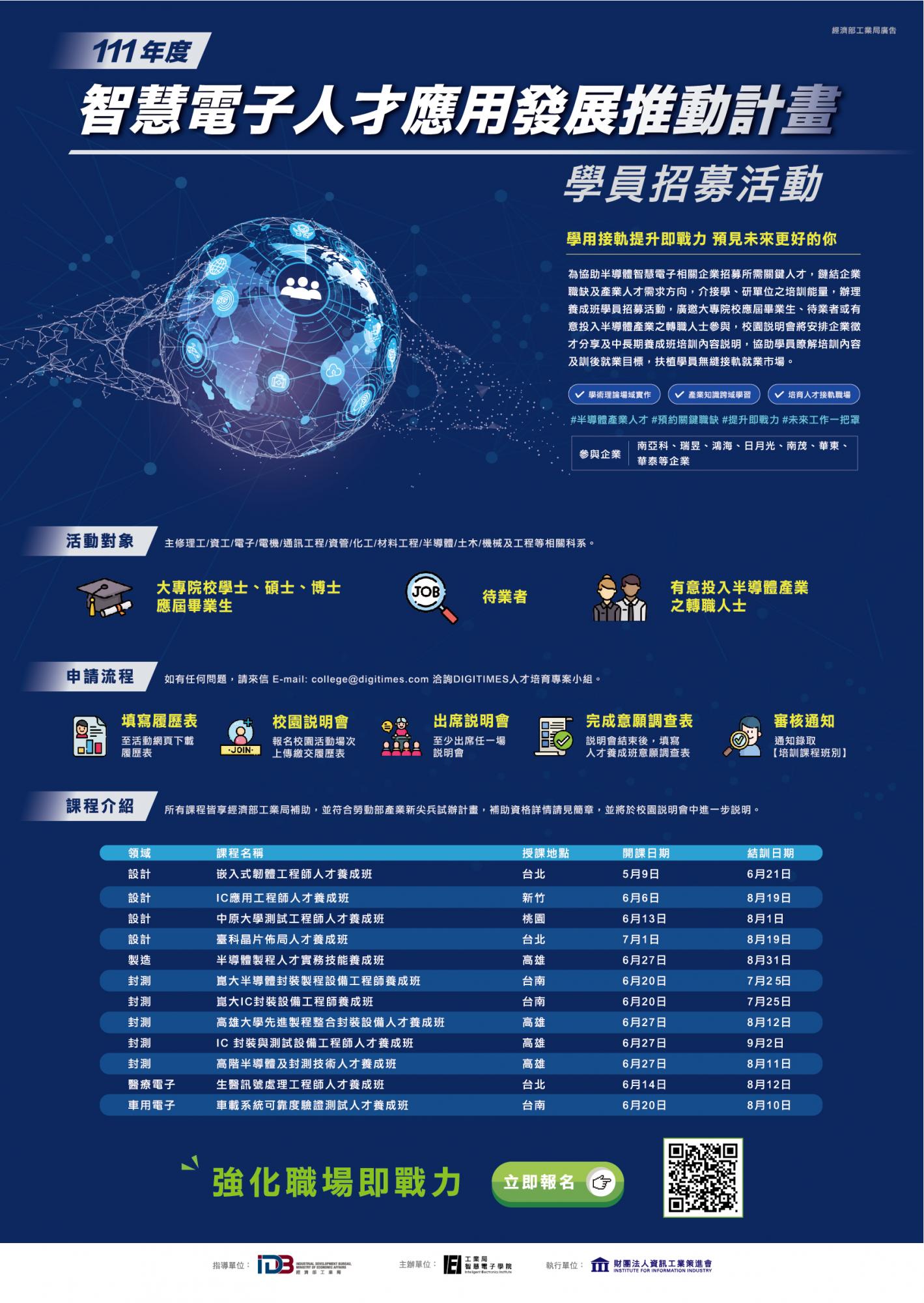 l 養成班課程:嵌入式韌體工程師人才養成班、IC應用工程師人才養成班、測試工程師人才養成班、晶片佈局人才養成班、半導體製程人才實務技能養成班、半導體封裝製程設備工程師養成班、IC封裝設備工程師養成班、先進製程整合封裝設備人才養成班、生醫訊號處理工程師人才養成班、車載系統可靠度驗證測試人才養成班